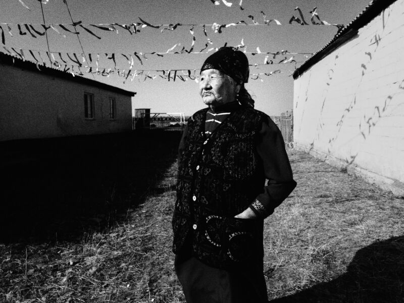 Анне Менкеевой летом исполнилось 85 лет. Около 25 лет назад она переехала из Шин-Мера в поселок Кетченеры, к сыну и невестке. Говорит Анна в основном на калмыцком языке. На ней платье с серебряным узором, ярко-зеленая косынка и золотистые серьги.
