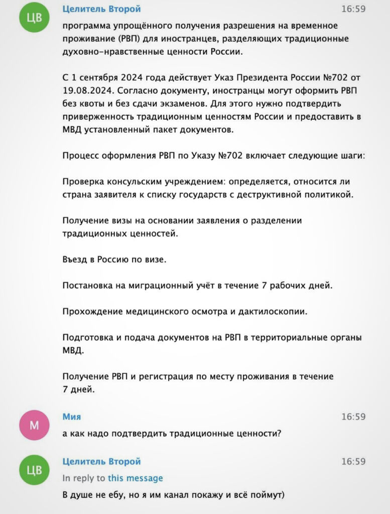 Правда, недавно Целитель Второй заявил подписчикам канала, что уходит с поста руководителя, потому что нашел девушку и теперь у него «вообще нет времени и денег на атаки». В переписке с Мией он также рассказал, что якобы ждет российский паспорт и планирует переехать в Россию. Активист надеется на облегченную процедуру переезда, которую президент РФ своим указом пообещал иностранцам, разделяющим «традиционные ценности».