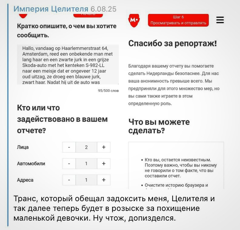 В арсенале методов Целителя Второго — не только организация онлайн-травли ЛГБТ*-активистов и накрутка ботов на их каналы, но и жалобы в госорганы европейских стран, где живут его «цели». Например, он попробовал навредить живущей в Нидерландах трансдевушке Мие Григорьевой. Сперва убеждал ее в том, что «ЛГБТ* — это результат травмы», потом пытался увести у нее телеграм-аккаунт, а затем угрожал «отобрать детей» и ради этого написал заявление в полицию.