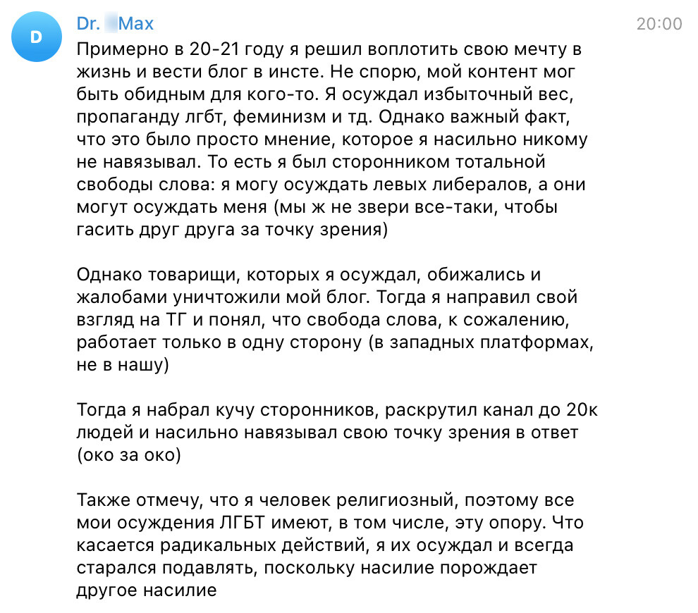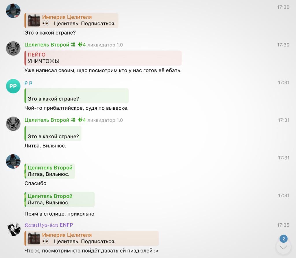 Раньше этот юзер был активным пользователем в телеграм-канале «Фемхантер», который изначально был посвящен высмеиванию блогерок, говорящих о проблемах женщин, но к осени 2024 года в основном сосредоточился на борьбе с ЛГБТ*. Теперь Целитель Второй хвастается, что именно он «организовал приезд к Сашеньке», имея в виду пугающий визит активистов к Казанцевой в Вильнюсе.