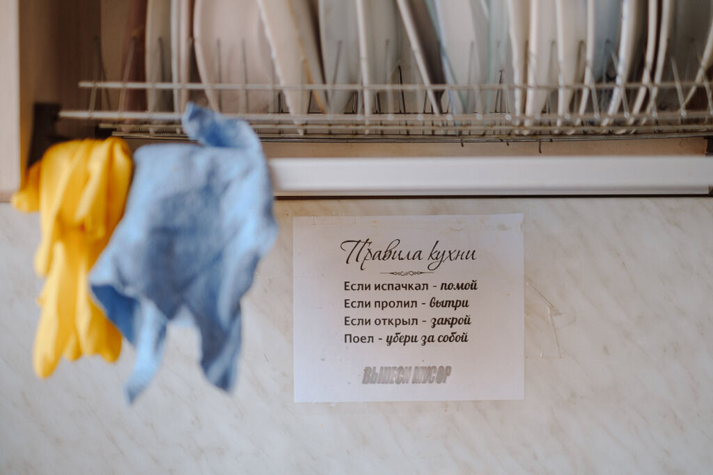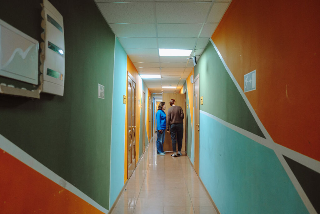Пока она рассказывает, мы продолжаем экскурсию по кризисному центру. Идем по коридору, покрашенному в теплые оттенки зеленого и оранжевого. Проходим мимо жилых комнат и прачечной. Из кухни доносится аппетитный аромат чего-то жареного. В помещениях центра чисто и уютно — чувствуется заботливая рука.