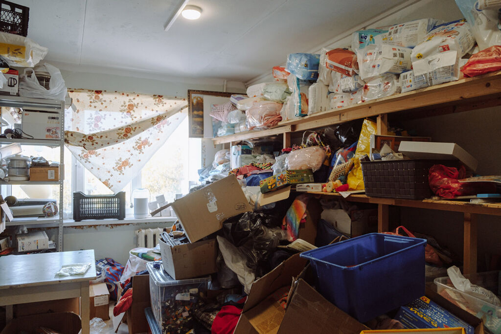 Нам показывают гуманитарный склад, заставленный коробками с одеждой, памперсами, игрушками, продуктами. Десятки семей в месяц получают вещи и еду с этого склада, говорит Людмила.