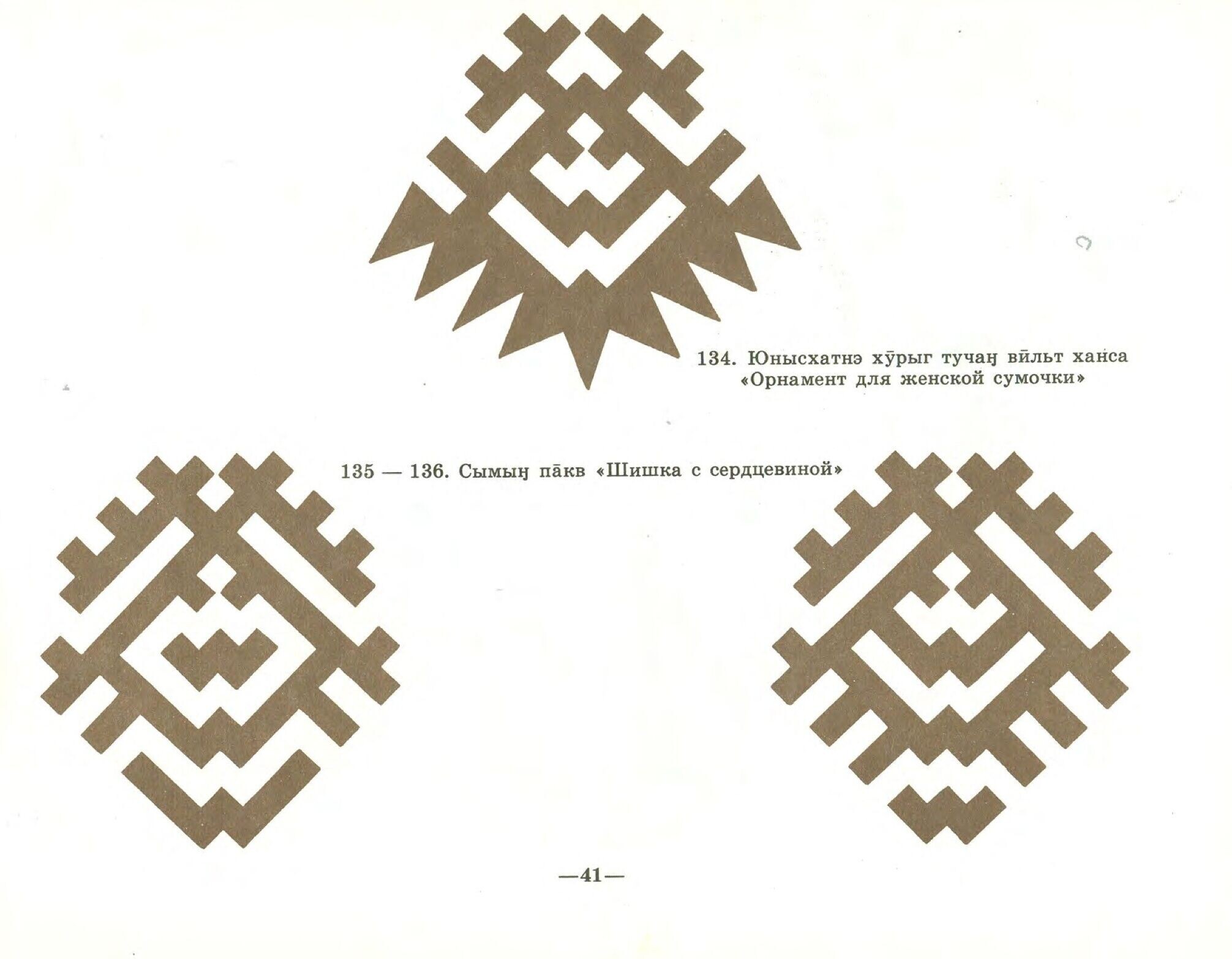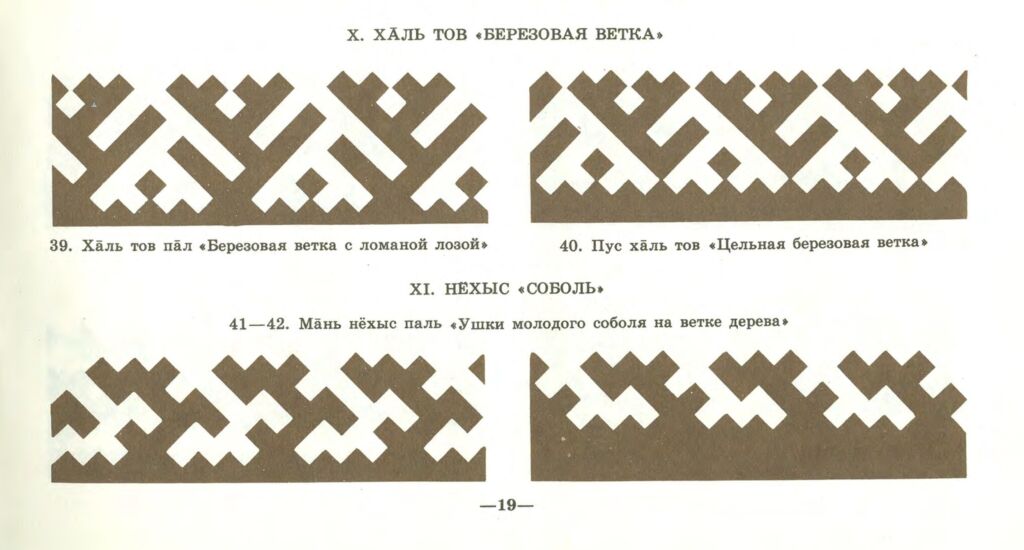 Оказалось, что мансийский узор состоит из трех основных элементов: зигзага, «головки» и «заячьих ушек», — которые можно складывать в более сложные узоры. Я прочла об этом в альбоме «Мансийские орнаменты», созданном на основе коллекции художника-самоучки Петра Шешкина, который собирал народные предания, легенды и сказки.