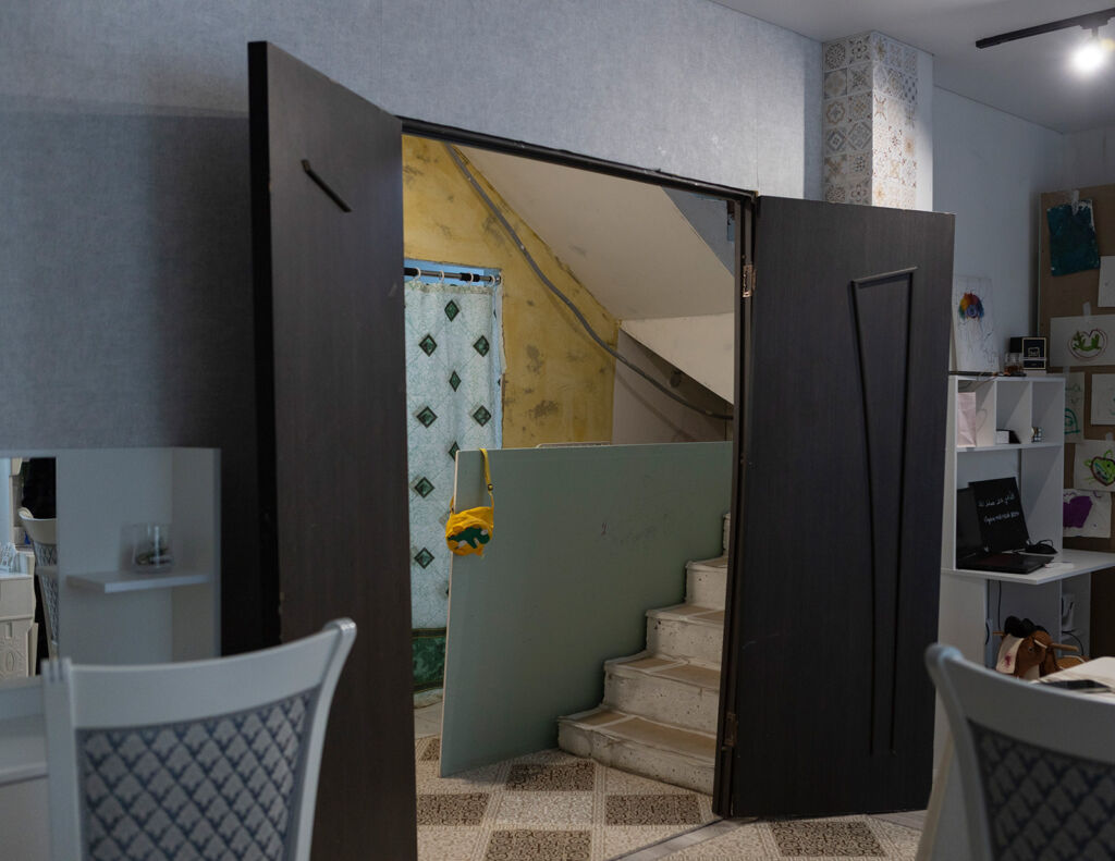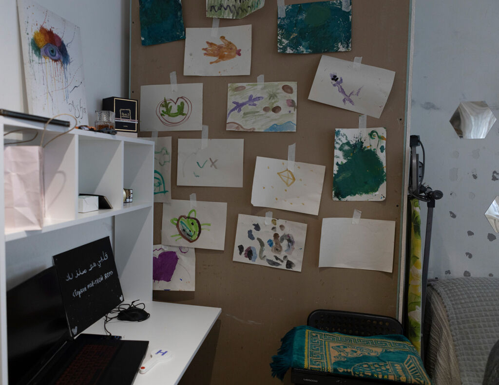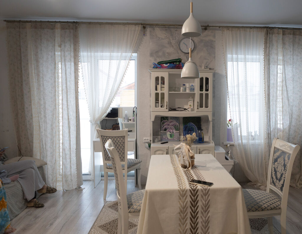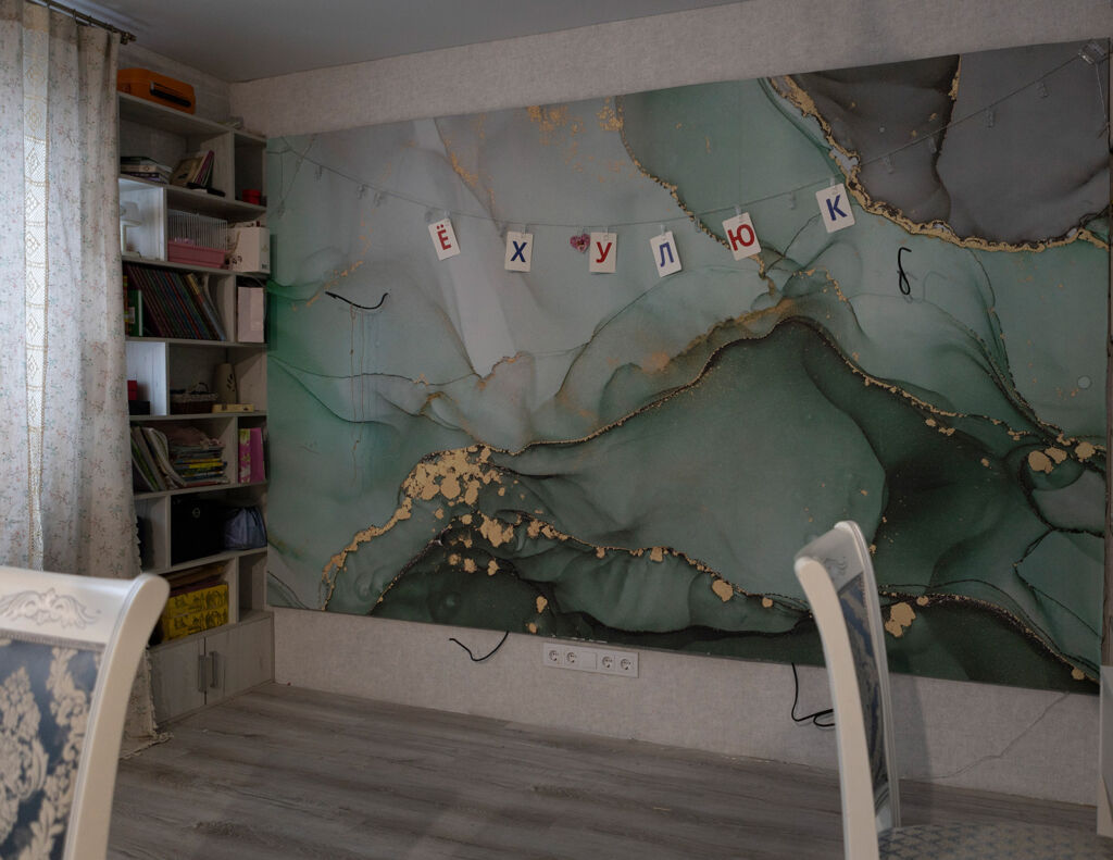 Мы приезжаем в дом Гайсиных. Перед ним стоит пустой ларек — раньше Данис продавал там мясо. Теперь ларек перевезли во двор. Камила и Аиша встречают нас в платках. На кухонном шкафу — связки сушеных трав: старшая, Камила, изучает лекарственные растения. На грифельной доске в комнате арабская вязь и перевод: «Сердце мое — твой дом».