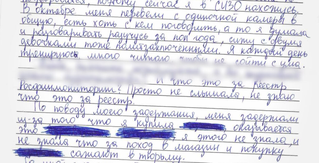 «Я писала письма в СИЗО-4 города Камышлов — там было два адресата. Сотрудники СИЗО написали, что доложат на меня в ФСБ за оправдание терроризма, потому что я общаюсь с “террористами”. Месяц или два они меня буквально терроризировали. Когда я отправляла письмо и прикладывала бланк ответа, они писали на этом же бланке: “Не пишите сюда”, “Мы все проверим”, “Чем вы занимаетесь”. В общем, пытались напугать. Думаю, это все оттого, что им не нравится поток писем, который сейчас идет политзаключенным, особенно известным. Они пытаются всячески от этого отделаться — у них просто прибавилось работы».