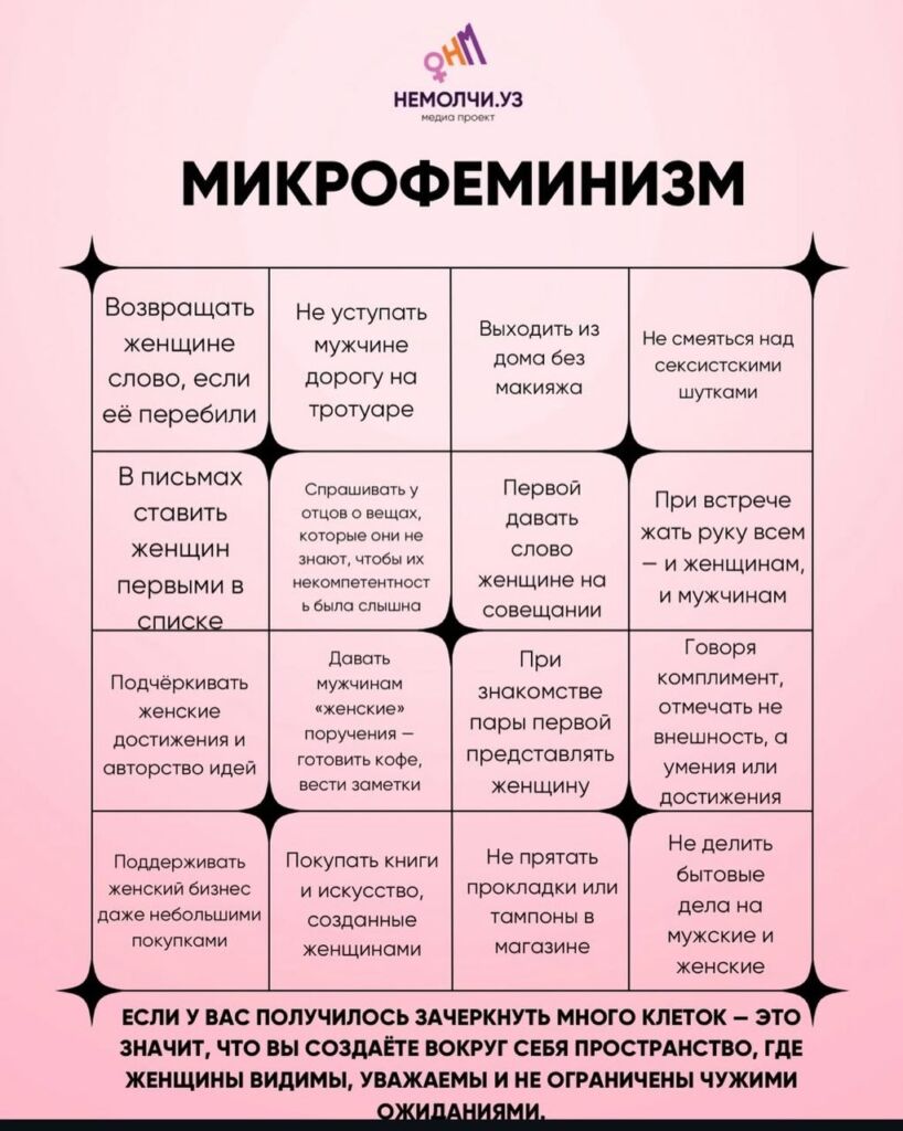 Микрофеминизм — совокупность малых, повседневных, часто едва заметных действий, которые помогают менять привычные гендерные правила в языке, общении, работе и другом социальном взаимодействии.
